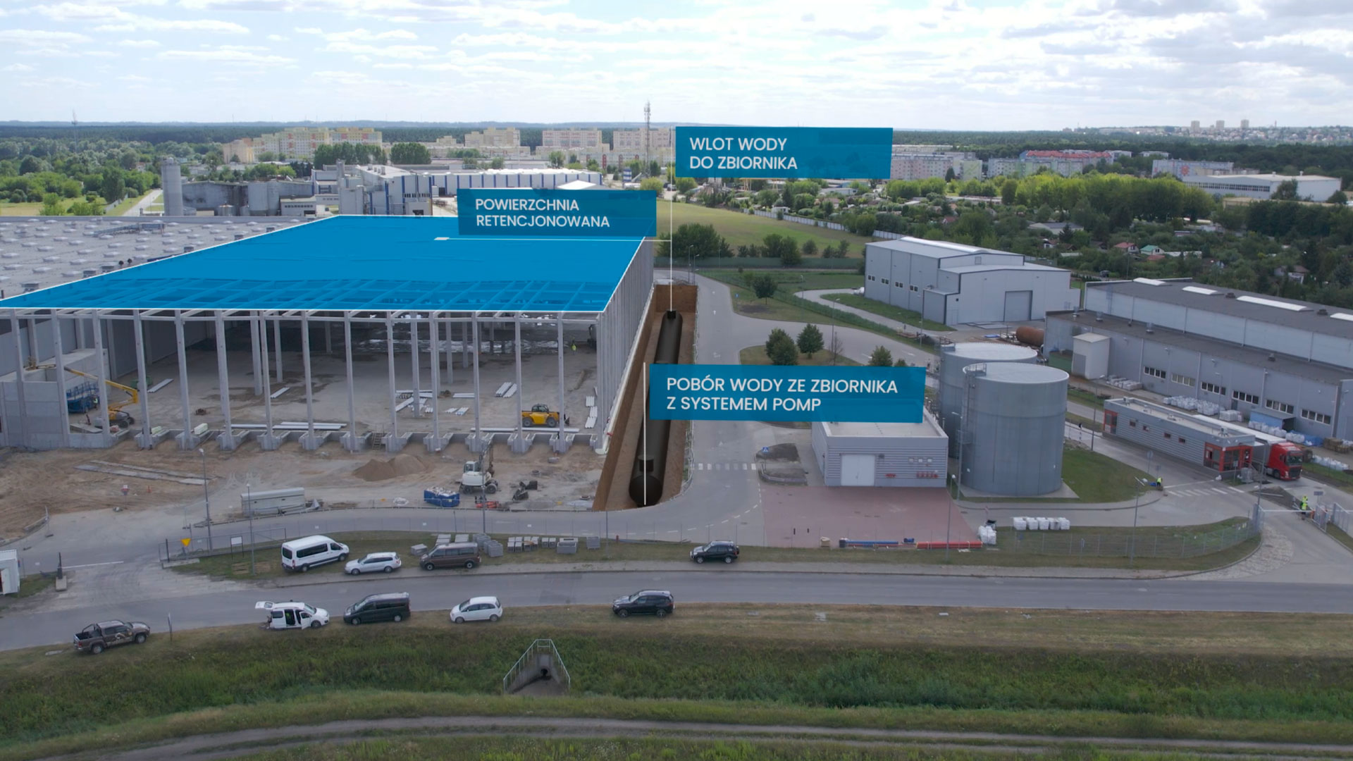 Połączenie obrazu filmowego nagranego dronem z animacjami pozwoliło uzyskać dynamiczną i nowoczesną prezentację inwestycji, oraz zasadę działania inteligentnych zbiorników retencyjnych firmy Uponor